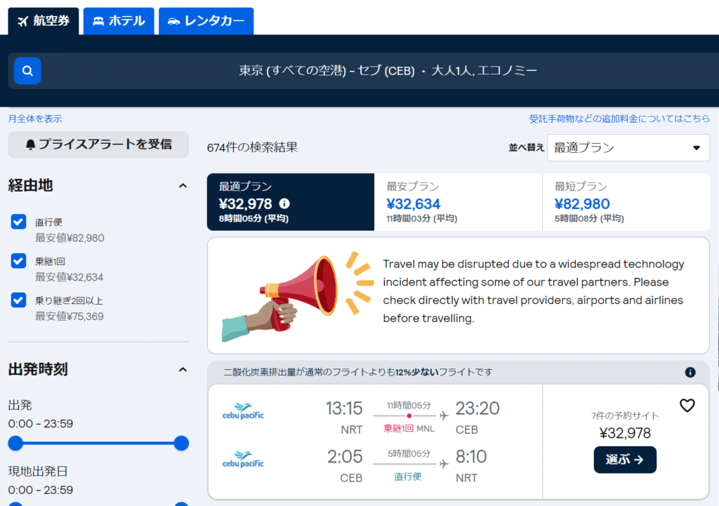 「東京~セブ島」で調べてみると、最安値は往復32,978円でした。