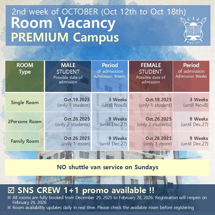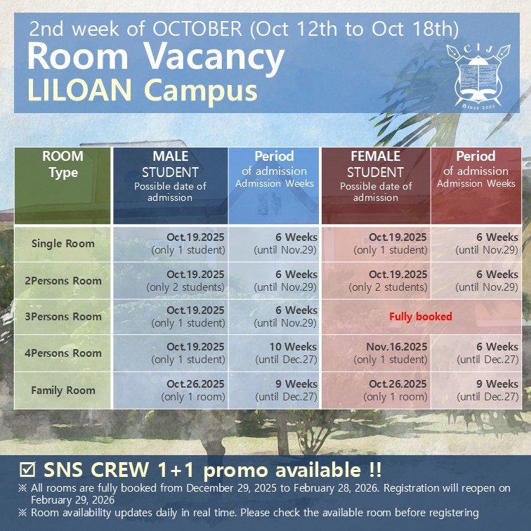 セブ島の人気語学学校 CIJ Academy & School より、最新の空室状況が届きました。