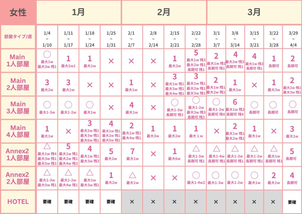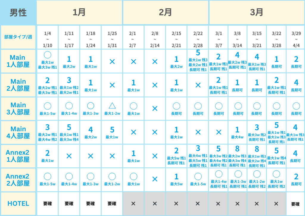• 1人部屋(Deluxe含む): メイン1人部屋は男女共通で空室があります。特に「Deluxe メイン1人部屋」は12月28日以降長期での受け入れが可能ですが、残り2枠となっております。
