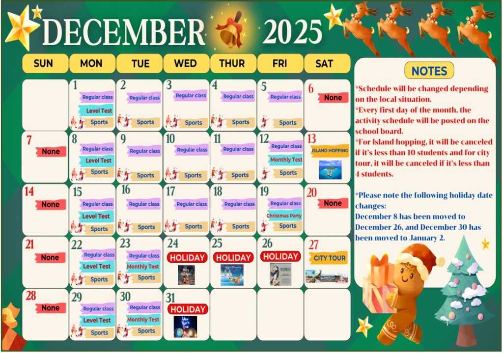 年末年始に滞在される方は、以下の期間が休講となりますのでご注意ください。