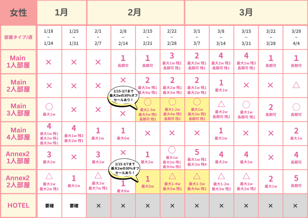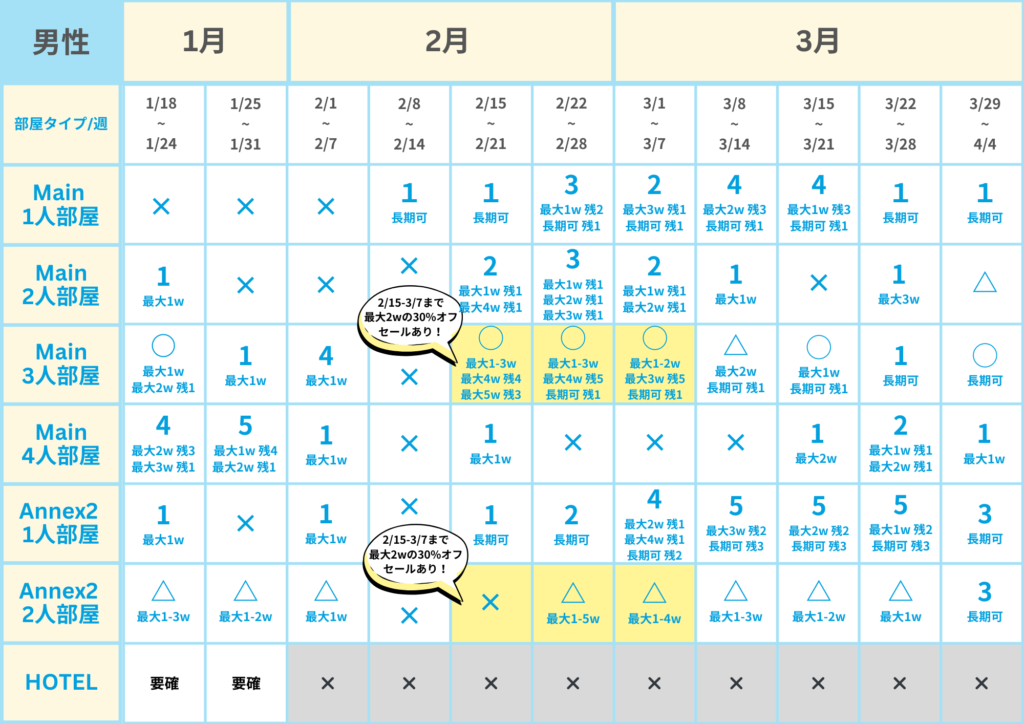 • 1人部屋(メインキャンパス):2月は満室に近い状況ですが、日程により調整可能な場合があるため個別にお問い合わせください。