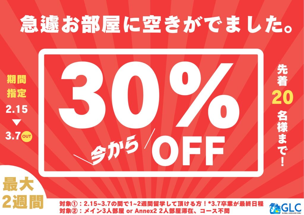 セブ島の人気校Global Language Cebu(GLC)より、春休み期間を対象とした驚きのビッグキャンペーンと最新の空室状況が届きました。 今回の案内は、特に「2月〜3月に短期留学を検討している方」や「費用を抑えつつ多国籍な環境で学びたい方」にとって、見逃せない絶好のチャンスとなっています。