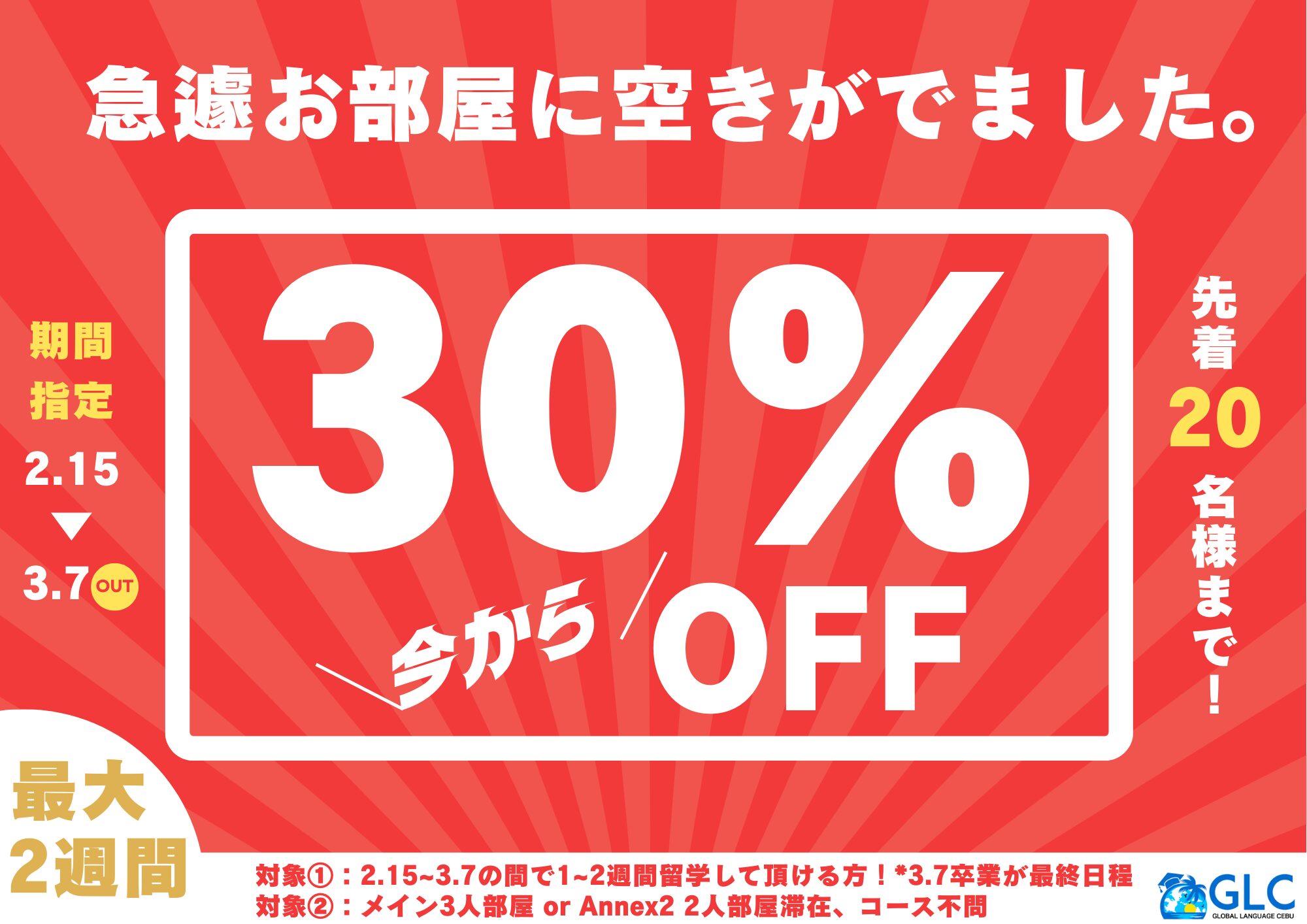 【GLC】春休み空室情報と30%割引キャンペーン|2月15日~3月7日