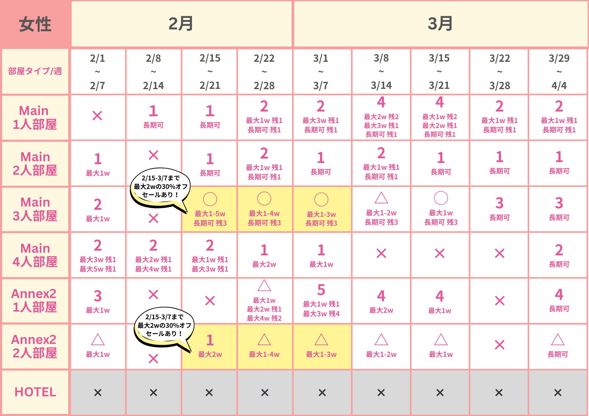メイン1人部屋(Deluxe含む):男女共通で空室あり