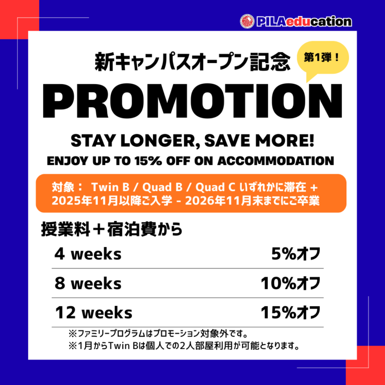 PILAは実践的な英語力強化に力を入れる語学学校で、学習環境とコストバランスの良さが魅力です。今回の最大のポイントは、為替影響を受けない「1ドル=135円固定レート」が適用され、さらに長期割引とも併用できる点です。