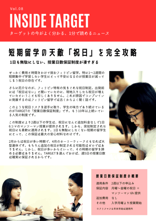 フィリピンでは2月から4月上旬にかけて、卒業旅行や春休みを利用した短期留学生が増える一方で、現地では祝日が重なるシーズンでもあります。通常、語学学校は祝日が休校となりますが、TARGETでは以下の対応を実施しています。