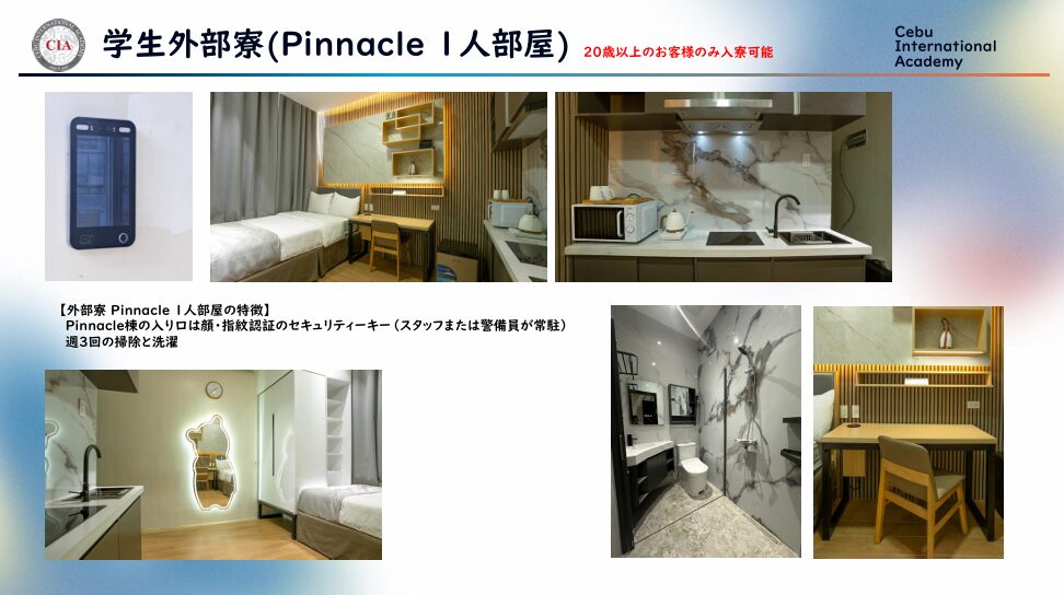 セブ島の人気校CIA(Cebu International Academy)より、利便性とプライベートを両立した外部寮「Pinnacle(ピナクル)」の詳細と、最新の空室状況が届きました。