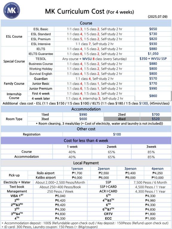 MK Language Training Centerは、フィリピン・イロイロ市に位置し、広大なキャンパスと落ち着いた学習環境が魅力の語学学校です。今回のプロモーションは、2026年内の滞在を検討されている方にとって、授業料と寮費が共に対象となる過去最大級の割引率となっており、費用を大幅に抑えて留学できる絶好の機会です。