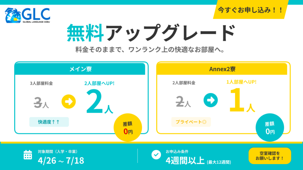 【Global Language Cebu】お部屋無料アップグレードキャンペーン!2026年4月〜7月の最新空室情報