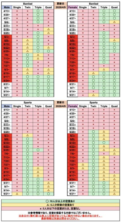 繁忙期に向けて空室状況は日々変動しております。ご希望のお部屋タイプやコースの最新の空き状況については、随時個別にお調べいたしますのでお問い合わせください。