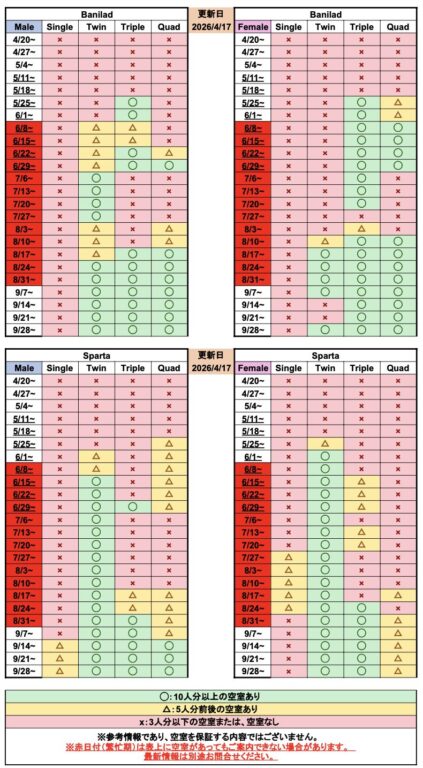 現在、繁忙期に向けて空室状況が日々変動しています。