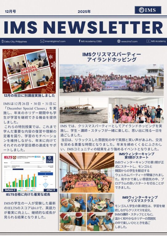 フィリピン留学の人気校IMSより、最新の活動をまとめた12月号のニュースレターと、直近の空室状況に関する案内が届きました。今回の案内では、年明け1月・2月の留学を検討されている方へ向けた、最新の受け入れ可能状況について詳しくお伝えします。
