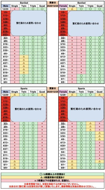 1月・2月の空き状況: 満室に近い日程も出てきております。多国籍な環境を維持するため、国籍比率も常に調整されています。検討中の方は、まずは現在の空き状況をリアルタイムでお問い合わせください。