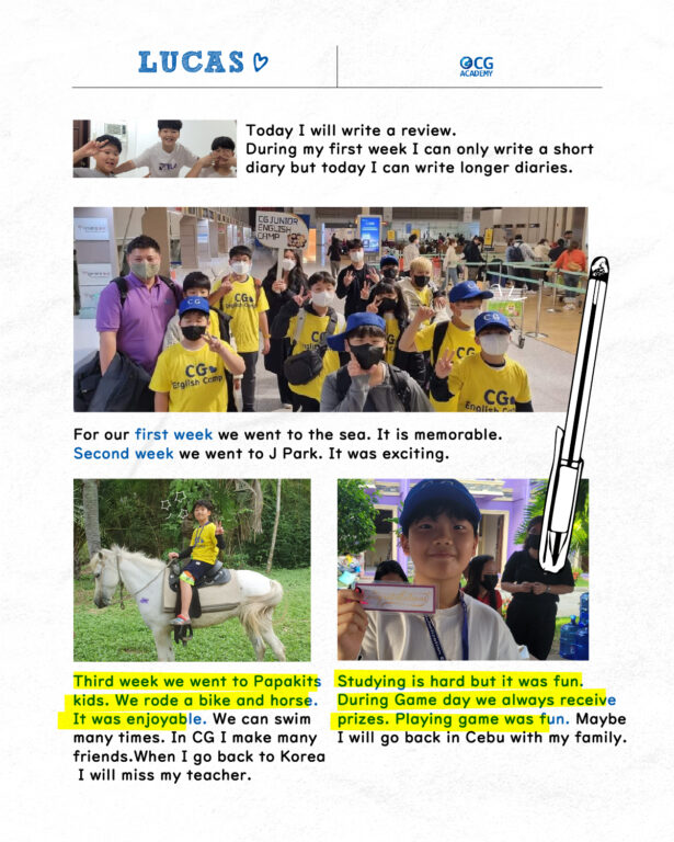 長期休みを利用したジュニアキャンプ(韓国出身)では、子供たちの自立心と英語への興味が劇的に向上します。4週間の参加で、最初は短い日記しか書けなかった子供が、帰国前には長文の英語日記を書けるようになるほど、書く力と話す力がバランスよく伸びるのが特徴です。